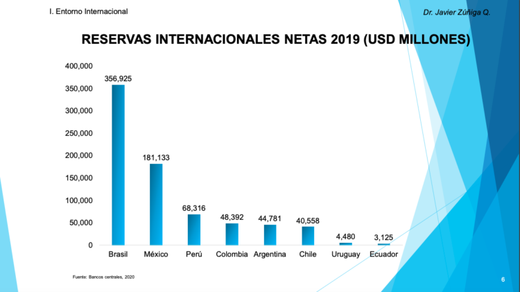 • Brasil (USD 356,925 millones), México (USD 181,133 millones) y Perú (USD 68,316 millones) son los países de la región latinoamericana con la mayor acumulación de reservas internacionales, teniendo mayor poder de intervención ante posibles choques negativos internos y/o externos en sus economías.