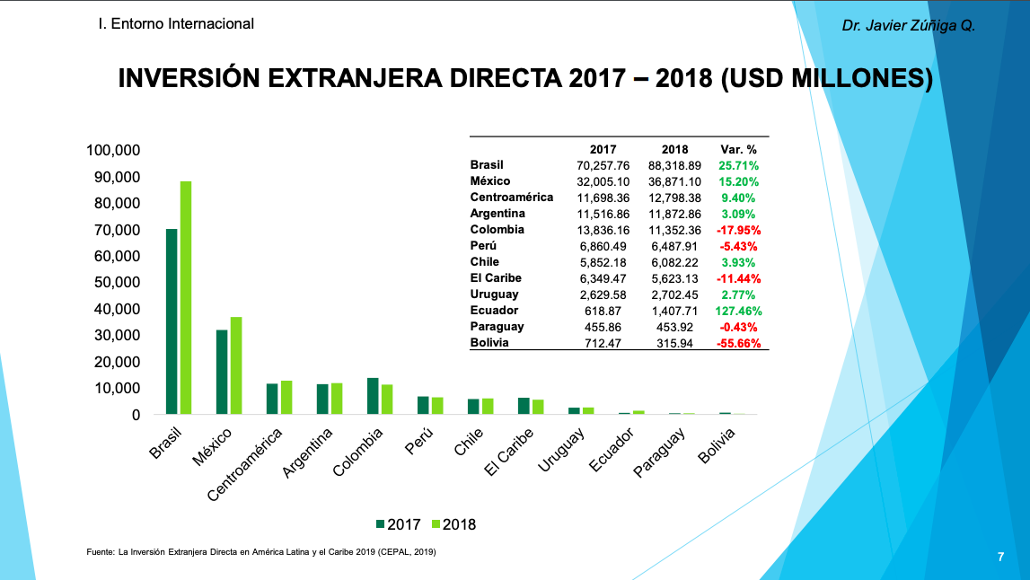 • Las últimas cifras publicadas por la CEPAL indican que Brasil (USD 88,319 millones) y México (USD 36.871 millones) recibieron los mayores montos de inversión extranjera directa (IED).