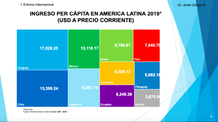 • El FMI proyecta que Uruguay (USD 17,029), Chile (USD 15,399) y México (USD 10,118) serán los países con ingresos per cápita por encima del umbral de USD 10,000.