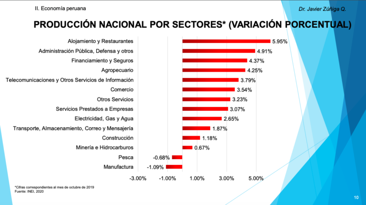 • Los sectores Alojamiento y Restaurantes (5.95%) y Administración Pública (4.91%) presentaron el mayor crecimiento en octubre de 2019, mientras que los sectores Pesca (-0.68%) y Manufactura (-1.09%) presentaron una reducción de su producción en el mes señalado.