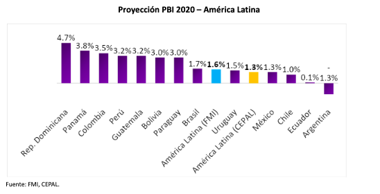El Fondo Monetaria Internacional (FMI), pronosticó en su último informe de “Perspectivas de la Economía Mundial”, que la región latinoamericana crecería 1.6% en el 2020, debido a las perspectivas a la baja del crecimiento económico de México y Chile. Ante esta situación, el crecimiento de Brasil (1.7%) estaría mitigando este efecto en la región por la aprobación de la reforma de las pensiones y la mejora del sector minero.