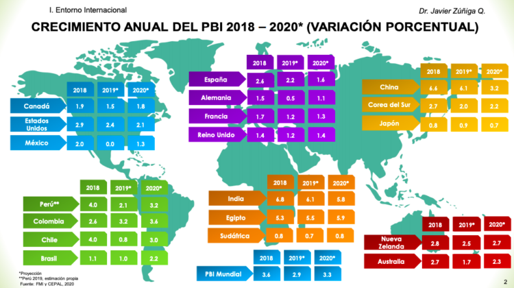 • China e India, en el 2019, serán los dos países con el mayor crecimiento económico nivel mundial, con 6.1%, cada uno. Colombia (3.2%) y Perú (2.1%) serían los países sudamericanos con mayor crecimiento en el año 2019. En 2020, la economía mundial será liderada por Egipto (5.9%) e India (5.8%).