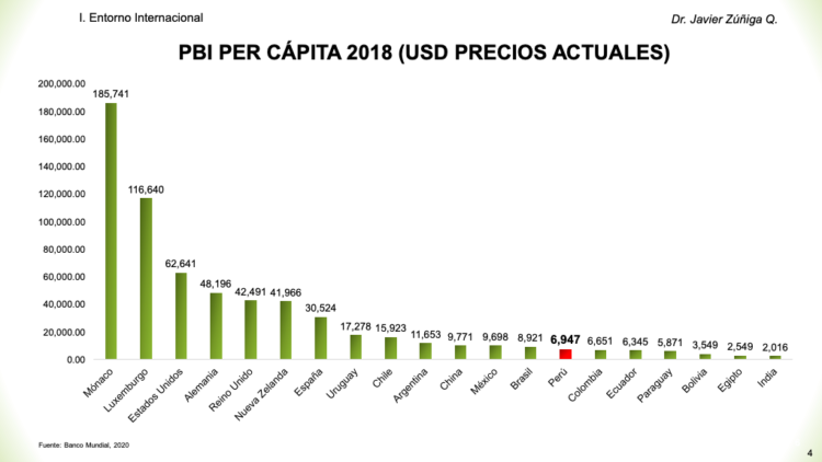 • Mónaco (USD 185,741) y Luxemburgo (USD 116,640) son los países con mayor PBI per cápita a nivel mundial. En América Latina, Uruguay (USD 17,278), Chile (USD 15,923) y Argentina (USD 11,653) son los países que superan el per cápita de USD 10,000.