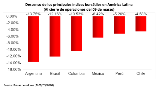 La disminución en los índices bursátiles alrededor del mundo y América Latina, al inicio de la semana del 9 de marzo, se produjo por el desplome en más de 30% de los precios futuros del petróleo, ante un desacuerdo de los miembros de la OPEP para recortar su producción y la guerra de precios entre Arabia Saudita y Rusia. Los precios futuros del Brent (cotizado en la Bolsa de Londres) y el West Texas Intermediate (WTI, cotizado en Estados Unidos) alcanzaron los US$ 31.50 y US$ 31.02 por barril, respectivamente; la mayor caída del crudo, en un día, desde la Guerra del Golfo.