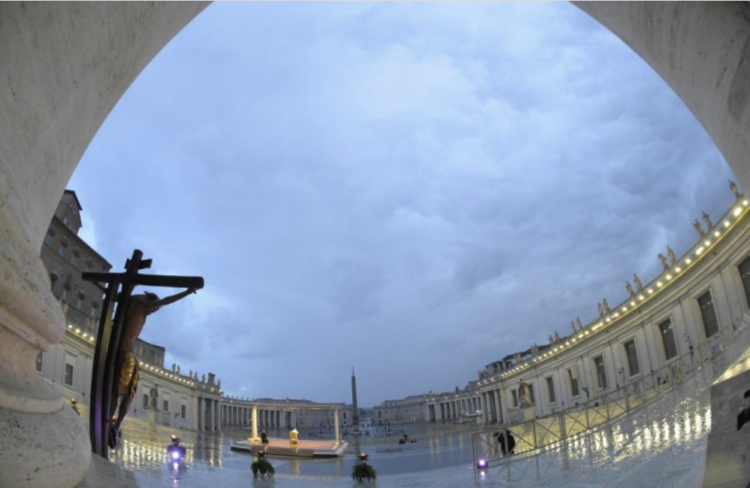 Uno scenario da far tremare le vene e i polsi. Piazza San Pietro vuota, abbracciata da un colonnato che si erge contro un cielo plumbeo che, con l’avanzare della sera, diventa oscurità. Piove. Nessun altro rumore, se non il garrito stridulo di qualche gabbiano, la sirena di un’autoambulanza. E’ il silenzio che prevale. Davanti al cancello centrale della Basilica sei bracieri. A destra e a sinistra l’icona di Maria Salus populi romani e del Crocifisso ligneo di San Marcello al Corso. Scenario, come si suol dire, ‘apocalittico’. Una figura bianca sale verso il sagrato. Ha il passo che vorrebbe essere deciso, ma in realtà è incerto perché la sciatica si sente e si vede. Ultimi scalini con mons. Guido Marini, il maestro delle cerimonie pontificie. Poi dal palco/altare, sottotetto: Nel nome del Padre, del Figlio e dello Spirito Santo. L’orazione iniziale: “Preghiamo. Dio onnipotente e misericordioso, guarda la nostra dolorosa condizione: conforta i tuoi figli e apri i nostri cuori alla speranza, perché sentiamo in mezzo a noi la tua presenza di Padre. Amen ”