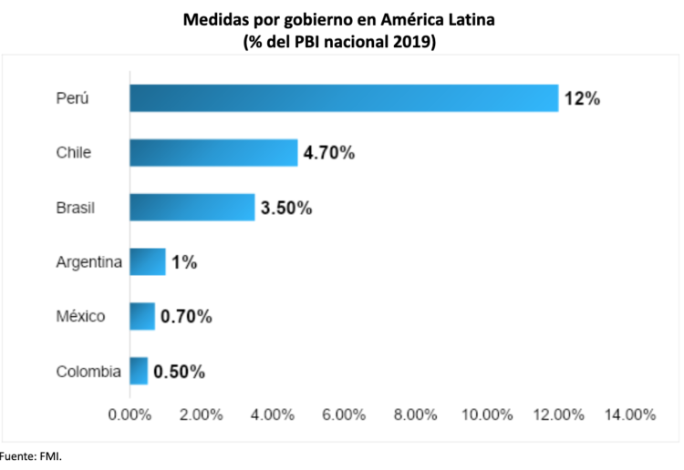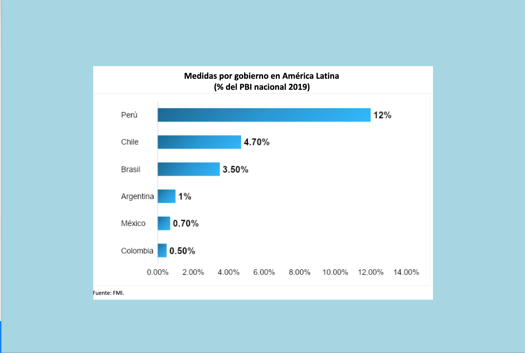 En Argentina, la propuesta para combatir el coronavirus está referida al bono extraordinario dirigidos a jubilados (US$ 47), un ingreso familiar de emergencia (US$ 155), la rebaja de contribuciones patronales (pago de seguridad social), el establecimiento de precios máximos a los bienes de primera necesidad, regulaciones laborales, entre otros. Así, el conjunto de las políticas establecidas por Argentina estaría costando alrededor de un 1% del PBI nacional.
