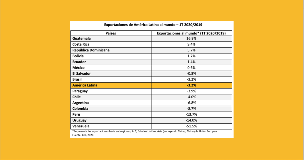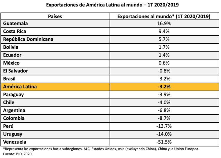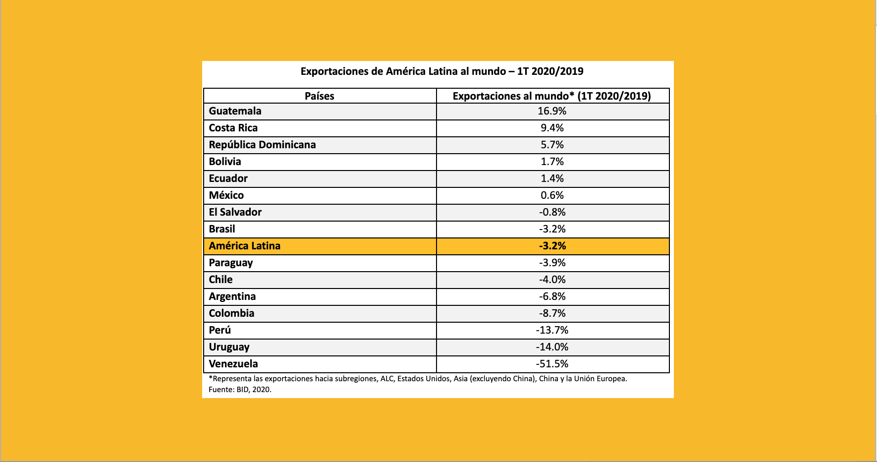El coronavirus (COVID-19), determinó que la gran mayoría de los países cerraran su comercio internacional casi por completo, además de una reducción en los volúmenes y los precios de bienes exportados. Como consecuencia se muestra una reducción de 3.2% para América Latina en el primer trimestre 2020 con respecto al 2019.