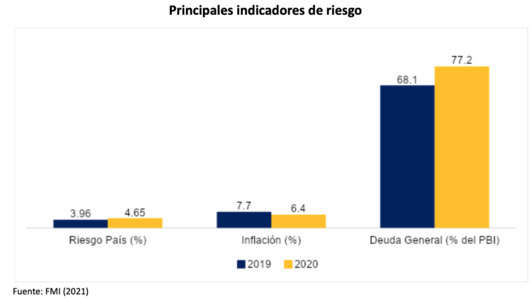 El riesgo económico se puede observar a través de la evolución de los principales indicadores económicos, como es el PBI y la inflación. En relación a la inflación, América Latina muestra una reducción de 1.3%, respecto del 2019. Si bien pareciera algo positivo, una inflación baja en muchos países muy cerca a la deflación indica que el dinamismo de la economía de la región no se ha recuperado. Es conveniente precisar que la inflación promedio observada en el 2019 y 2020 fue variada por las cifras de Argentina, la cual supera los 36%.
