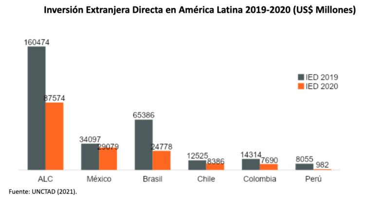 México con US$ 29,079 millones, Brasil con US$ 24,778 millones y Chile con US$ 8,386 millones fueron los países que obtuvieron más flujo de IED durante el 2020. Los países que reflejaron un mayor descenso de la inversión extranjera, durante la pandemia, fueron Perú y Brasil, con una reducción de -87.8% y 62.1%, respectivamente.