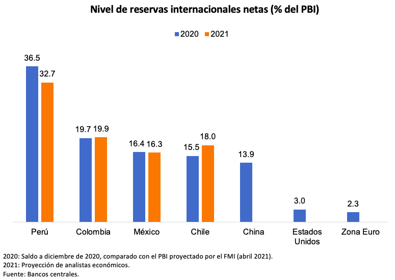 A diciembre del 2020, las reservas internacionales netas (RIN) de Perú representaban el 36.5% de su PBI, el más alto de la agrupación. Para finales del 2021, se espera que el nivel de reservas del Perú disminuya a 32.7% de su PBI, manteniendo su liderazgo en la Alianza del Pacífico. Las RIN de Colombia con 19.9% y las de Chile con 18.0% se incrementarían en el 2021, mientras que las RIN de México se reducirían en 0.1%.