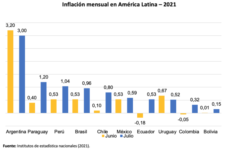 En el mes de Julio del 2021, Argentina alcanzó un 3.0%, Paraguay un 1.2% y Perú 1.04% siendo los países con el mayor aumento de precios mensual. Bolivia con 0.15%, Colombia con 0.32% y Uruguay con 0.52% mostraron el menor incremento de la inflación en el citado mes.