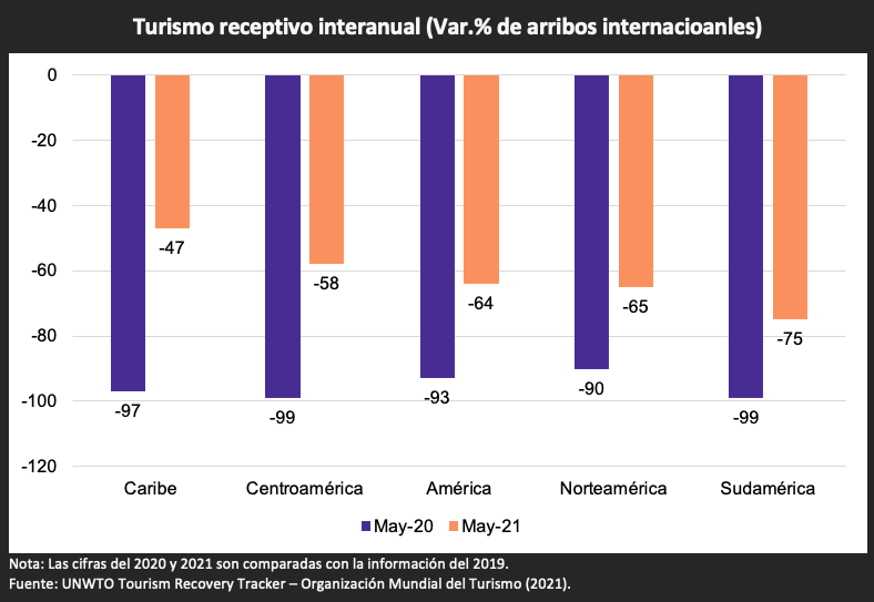 Como se puede observar en la gráfica, todas las cifras se encuentran en negativo, el esfuerzo por acelerar el proceso de vacunación y la mejora de protocolos de bioseguridad han permitido una mayor atracción de turistas, principalmente de Europa y Asia. Para Latinoamérica, la recuperación del turismo es fundamental para la reactivación económica y del empleo.