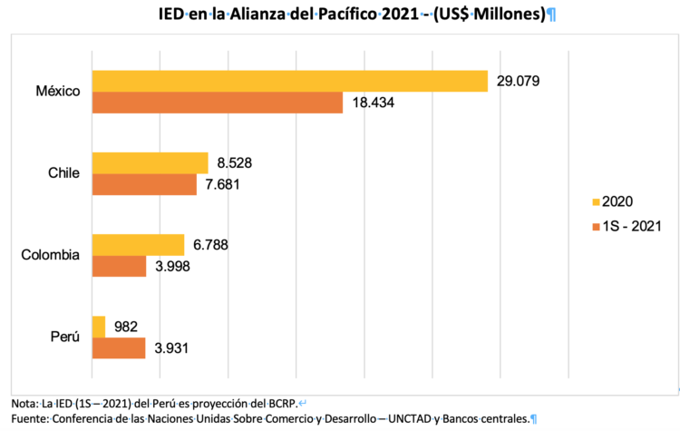 Al primer semestre del 2021, México posee la mayor cantidad de IED en la Alianza del Pacífico, con US$ 18,434 millones, seguido por Chile con US$ 7,681 millones, Colombia con US$ 3,998 millones y Perú con US$ 3,931 millones.