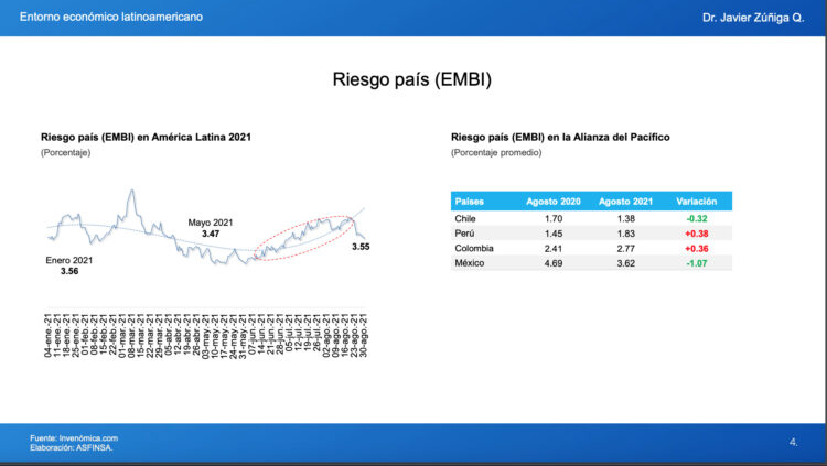 - Al 30 de agosto, el riesgo país (EMBI) de América Latina se situó en 3.55%. La tendencia al alza que se observa en el EMBI se debe a la difícil coyuntura política y social de la región, al igual que la preocupación por el estallido de la tercera ola de contagios por Covid-19.