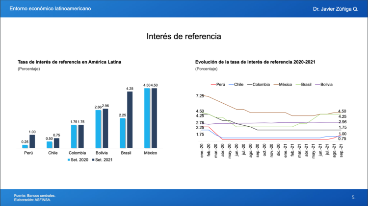 - Durante el 2020, con la finalidad de dinamizar la actividad económica, los bancos centrales de la región rebajaron sus tasas de interés de referencia, llegando a tasas cercanas a cero, como fue el caso del Perú de 0.25%. Al mes de setiembre, Chile presenta la menor tasa de referencia con 0.75%, seguido por Perú con 1.00% y Colombia con 1.75%.