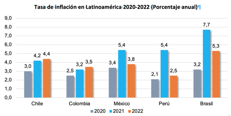 Si bien en Brasil se está produciendo un período de sequias y en Perú un escenario de incertidumbre política, la inflación del presente año es generalizada, independientemente de los factores internos de cada país. El aumento en el precio de los fletes de transporte marítimo (relacionado con la escases de contenedores), el encarecimiento de los combustibles y la apreciación del dólar americano son tres factores internacionales que impulsan la inflación mundial actualmente.