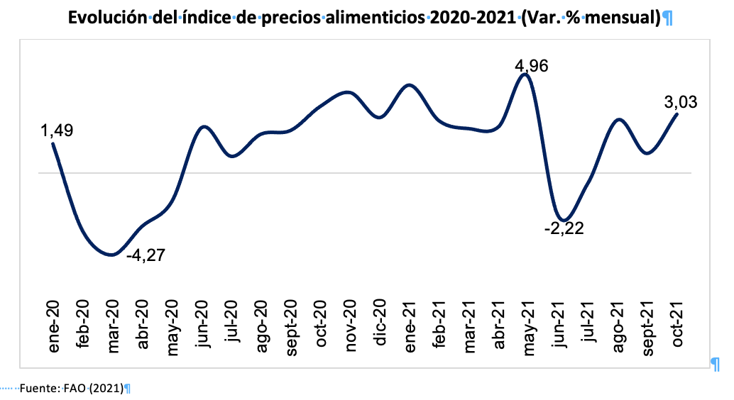 De acuerdo a la Organización de las Naciones Unidas para la alimentación y Agricultura (FAO), en octubre se registró una inflación de 3.03%, principalmente por el incremento de los precios de aceites vegetales y cereales. La inflación interanual alcanza un nivel de 31.3%, la cifra más alta desde el 2011. En el período 2020-2021, la paralización de la actividad económica mundial originada por el inicio de la pandemia ocasionó que en marzo de 2020 se registrara una deflación de 4.27%; además de ello, en junio de 2021 se observó una deflación de -2.22% causada por la menor cotización de cereales y aceites a nivel internacional.