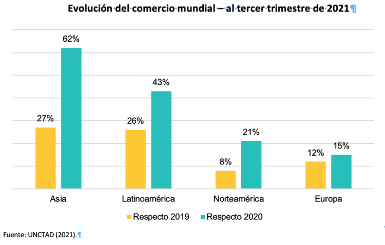 De acuerdo a la Conferencia de las Naciones Unidas sobre el Comercio y Desarrollo (UNCTAD), el comercio mundial en el 2021 alcanzará, aproximadamente, US$ 28 billones, representando un incremento de un 23% respecto del año 2020. Actualmente, Asia y Latinoamérica son las regiones que presentan el mayor incremento de su comercio al tercer trimestre de 2021, con respecto del año 2019 y 2020.