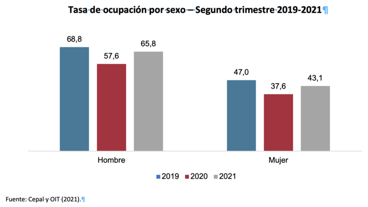 De acuerdo al informe, la tasa de ocupación tanto de hombres como de mujeres se deterioró fuertemente durante el segundo trimestre de 2020, alcanzando tasas de 57.6% y 37.6%, respectivamente. Si bien al segundo trimestre de 2021 dichas tasas se han ido recuperando, sin alcanzar los niveles pre pandemia, la ocupación laboral de las mujeres se ubica siempre por debajo del 50%.