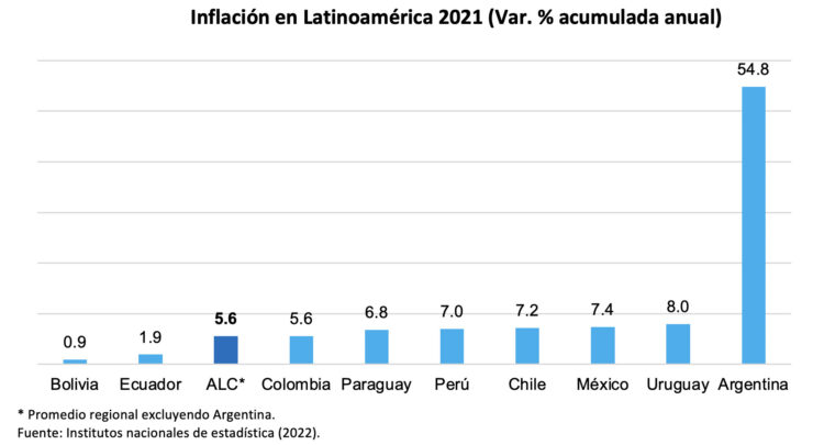 En Latinoamérica, la inflación promedio anualizada del 2021 fue de 5.6%, ubicándose gran parte de los países de la región por encima de dicha cifra, con excepción de Bolivia y Ecuador, los cuales culminaron el año con una inflación de 0.9% y 1.9%, respectivamente. La tasa de inflación regional, sin tener en consideración a Argentina, se ubicaría en 9.3%, cifra que no se observaba desde el año 2003.