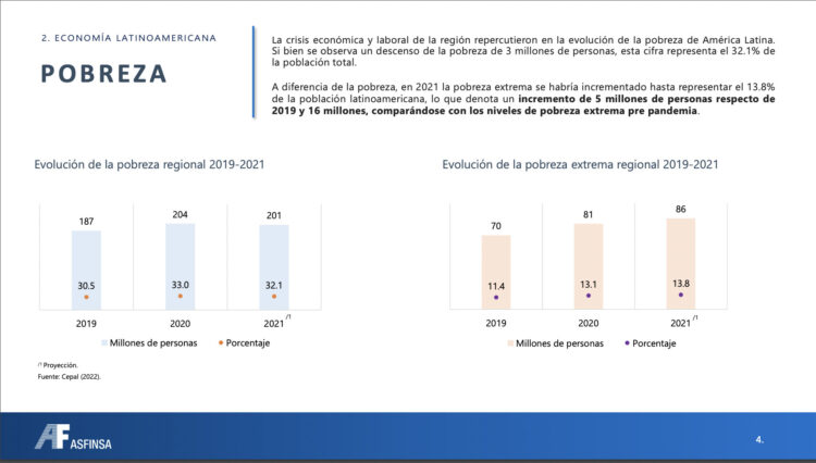 • En el 2021, la pobreza y pobreza extrema se habrían incrementando a 32.1% y 13.8%, respectivamente. Estas cifras muestran que existen 14 millones más pobres que en el año 2019 y 16 millones de personas en situación de pobreza extrema que en el 2019. El incremento y la persistencia de los niveles de pobreza y pobreza extrema de la región son el resultado del (1) impacto de la pandemia, pero también de (2) la deficiencia en la adaptación del empleo a los canales virtuales y (3) la profundización de la discriminación laboral por sexo y edad.