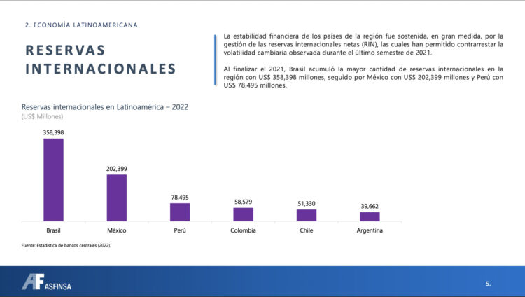 • Al finalizar el 2021, Brasil acumuló la mayor cantidad de reservas internacionales en la región con US$ 358,398 millones, seguido por México con US$ 202,399 millones y Perú con US$ 78,495 millones. En los siguientes meses, se prevé un incremento de las reservas internacionales en la región latinoamericana debido a la fuga de capitales europeos ante el conflicto de guerra en Ucrania.