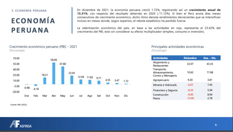 • En diciembre de 2021, la economía peruana creció 1.72%, registrando así un crecimiento anual de 13.31%, con respecto del resultado obtenido en 2020 (-11.12%). Las actividades de Alojamiento y Restaurantes con 32.07%, Transporte, Almacenamiento, Correo y Mensajería con 10.62% y Agropecuario con 9.20% fueron las de mayor crecimiento.