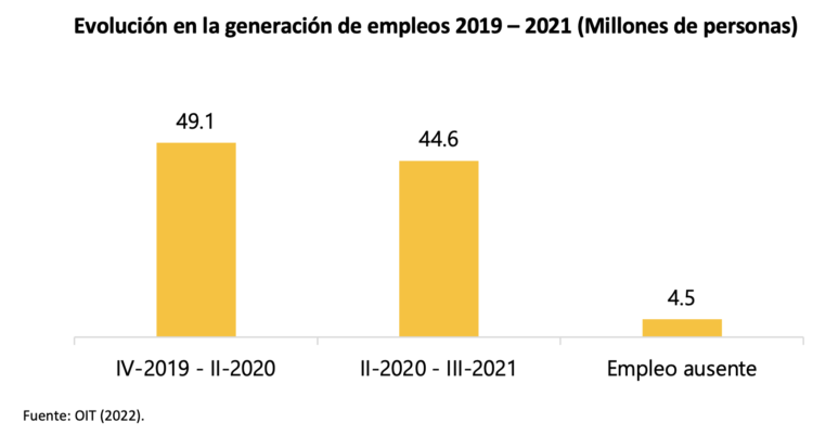 Si bien las políticas locales para incentivar el empleo fueron adecuadas, sus efectos no fueron los suficientes, porque no pudieron recuperar el empleo perdido. Según la OIT, entre el segundo semestre de 2020 y el tercer trimestre de 2021, 44.6 millones de empleos fueron creados, quedando 4.5 millones de empleos por recuperar.