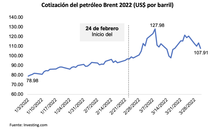 A inicios del presente año, la cotización del petróleo se encontraba en US$ 78.98 por barril, el cual alcanzó un máximo histórico de US$ 127.98 en los primeros días de marzo, luego del estallido de la guerra Ucrania – Rusia que fue el 24 de febrero. A finales de marzo, la cotización del barril de petróleo Brent, había aumentado en 36.6%, promedio.
