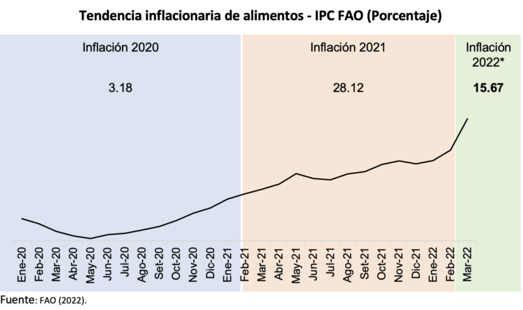De acuerdo a la Organización de las Naciones Unidas para la Alimentación y la Agricultura (FAO por sus siglas en inglés), como resultado de la recesión económica mundial causada por el Covid-19, la inflación de los alimentos se situó en el 2020 en 3.18%. En el 2021, la inflación se incrementó casi 9 veces respecto a lo observado en 2020, alcanzando la cifra astronómica de 28.12%, debido a la reactivación económica internacional (mayor demanda) en medio de la ruptura logística mundial. Al primer trimestre del 2022, la inflación se ubicaría en 15.67% como consecuencia de la elevada cotización internacional de los cereales a causa el conflicto Ucrania-Rusia.