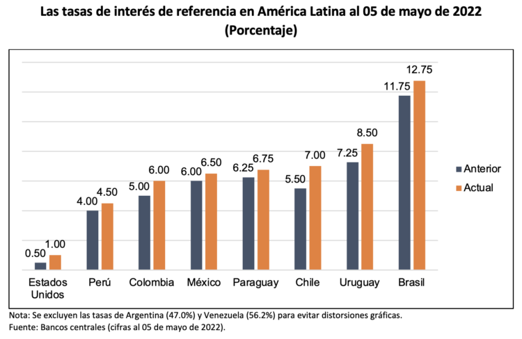 En Estados Unidos y en las principales economías de la región se observa una tendencia de aumento en lo que se refiere a las tasas de referencia. El motivo en común de estos incrementos se debe a la elevada inflación que se observa en el continente americano, y en el mundo en general, originada por la no culminación total de la pandemia del coronavirus y por el conflicto bélico entre Rusia y Ucrania; la cual podría controlarse (en cierta medida) al restringir la liquidez de los mercados locales.