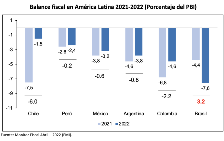 De acuerdo a las cifras publicadas por el Fondo Monetario Internacional (FMI), los países que culminarían el 2022 con el menor déficit fiscal de la región serían Chile con -1.5%, Perú con -2.4% y México con -3.2%. La mayor reducción de dicho déficit se observaría en Chile con un 6.0%, seguido por Colombia y Argentina con 2.2% y 0.8%, respectivamente.