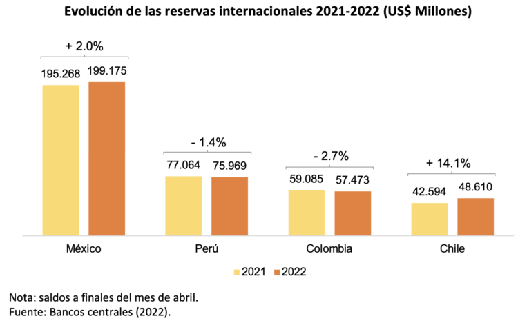 De acuerdo a las estadísticas de los bancos centrales, México y Perú son los países de la Alianza del Pacífico que acumulan la mayor cantidad de reservas internacionales netas en el 2022 con US$ 199,175 millones y US$ 75,969 millones, respectivamente. En términos de crecimiento, entre los meses de abril de 2021 y 2022, Chile es el país que tuvo un incremento de sus reservas internacionales en 14.1%, seguido por México con 2.0%.