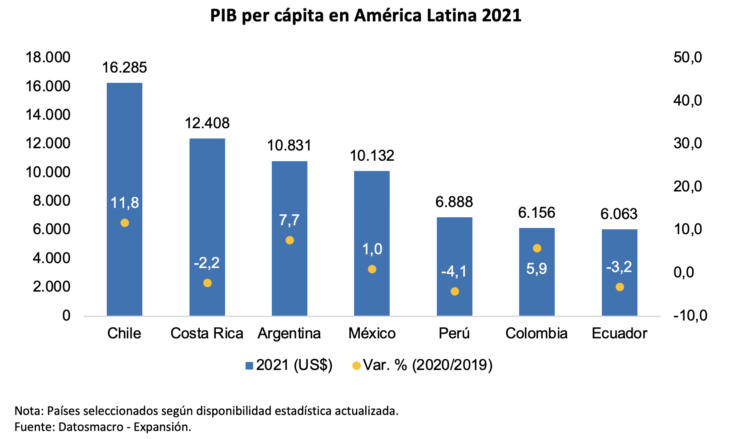 De los países seleccionados, al 2021 Chile lidera el ranking de PIB per cápita de la región con US$ 16,285, seguido por Costa Rica y Argentina con US$ 12,408 y US$ 10,831, respectivamente. Si lo comparamos con las cifras del año 2019, los países con el mayor incremento de sus ingresos por persona son Chile con 11.8% y Argentina con 7.7%, mientras que los países que registraron el mayor decrecimiento fueron Perú con -4.1% y Ecuador con -3.2%.