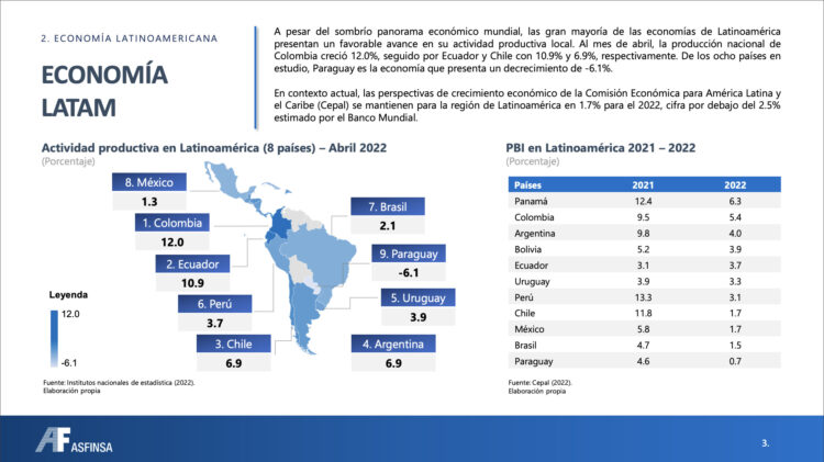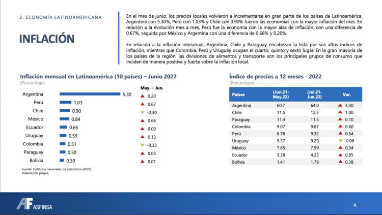 • En el mes de junio, los precios locales volvieron a incrementarse en gran parte de los países de Latinoamérica. Argentina con 5.30%, Perú con 1.03% y Chile con 0.90% fueron las economías con la mayor inflación del mes. En la inflación interanual, Argentina, Chile y Paraguay tienen los niveles más altos, mientras que Colombia, Perú y Uruguay se encuentran en el cuarto, quinto y sexto lugar.