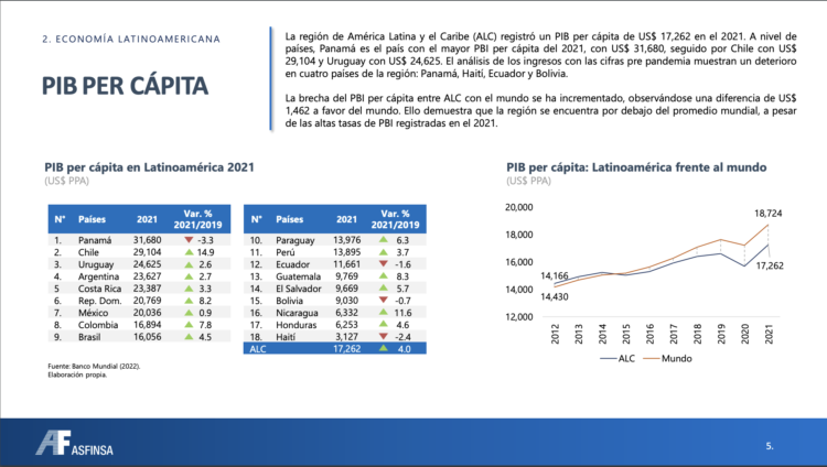 • La región de América Latina y el Caribe (ALC) registró un PBI per cápita promedio de US$ 17,262 en el 2021. Panamá es el país con el mayor PBI per cápita del 2021, con US$ 31,680, seguido por Chile con US$ 29,104 y Uruguay con US$ 24,625.