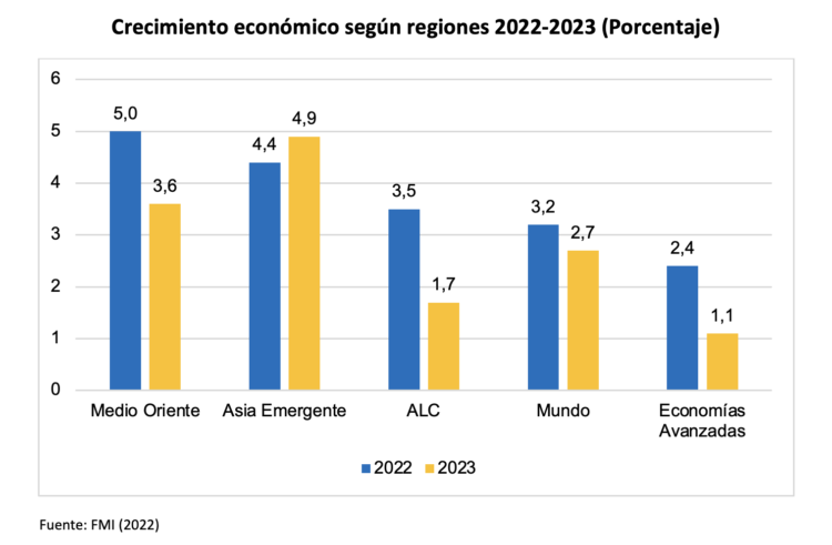 De acuerdo a los pronósticos realizados por el Fondo Monetario Internacional (FMI), en el 2022 las regiones del Medio Oriente con 5.0%, Asia Emergente con 4.4% y América Latina y el Caribe con 3.5% crecerán por encima del PBI mundial de 3.2%. En el 2023, Asia Emergente sería la única región en incrementar su PBI respecto del 2022; mientras que la mayor disminución en el crecimiento económico de dicho año se observaría en Latinoamérica.