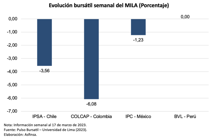 La crisis de confianza en los bancos también está alertando a los operadores de países emergentes. En este contexto, los principales índices de las bolsas de valores del MILA (Mercado Integrado Latinoamericano), han sufrido una disminución en esta semana, siendo Colombia la más afectada con una caída de -6.08%, seguida por Chile y México con -3.56% y -1.23%, respectivamente.