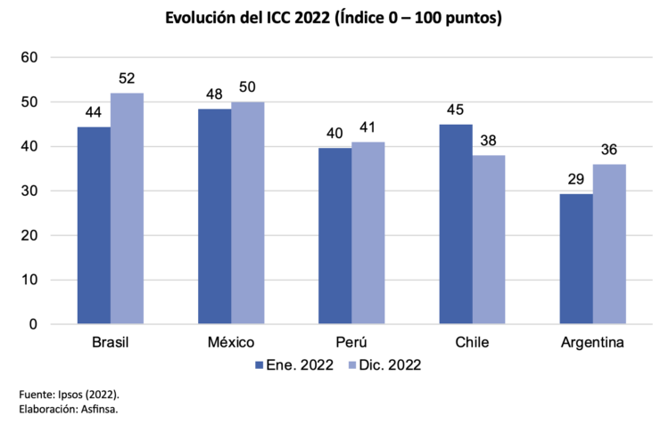 En el caso de Chile, si bien a lo largo del 2022 se observó una tendencia al alza, el ICC muestra que su nivel a diciembre fue de 6.9 puntos menor que el observado en enero, debido a la situación inflacionaria y social del país.