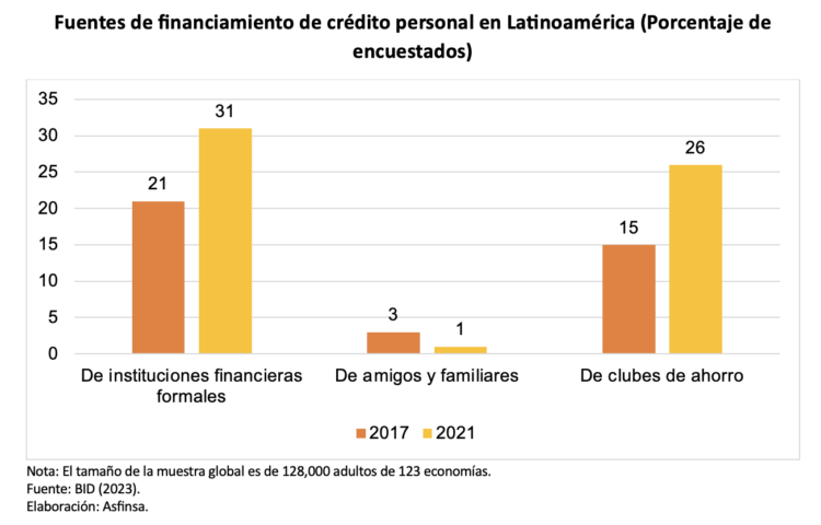 De manera global, la situación económica de la población en Latinoamérica ha incentivado que más personas adquieran financiamiento a través de instituciones formales, pasando de un 21% en 2017 a un 31% en el 2021. Una segunda alternativa son los clubes de ahorros, o juntas, cuyo porcentaje de participantes se incrementó de 15% a 26% en el período 2017-2021.