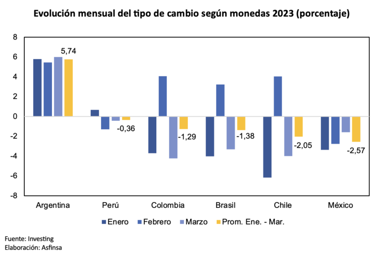 De acuerdo a la información cambiaria proporcionada por Investing, dentro de las principales economías de la región, Argentina presenta una depreciación de su moneda local de 5.74% durante el primer trimestre de 2023. En ese mismo período, México con -2.57%, Chile con -2.05% y Brasil con -1.38% son los países que presentan la mayor apreciación de sus monedas, con respecto del dólar americano.