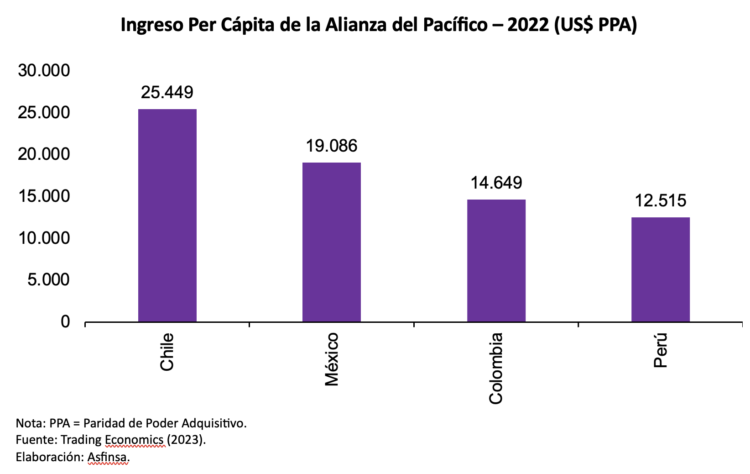 En el ranking de ingreso per cápita, para la Alianza del Pacífico, Chile lo lidera con US$ 25,449, seguido por México con US$ 19,086. Estas cifras indican que Chile tiene el mayor nivel de ingresos per cápita de los países miembros de la Alianza del Pacífico, lo que sugiere una mayor capacidad de compra por parte de sus habitantes.