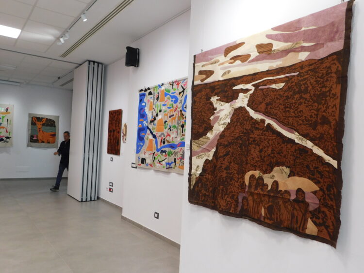 Estamos en otra parte del Perú, estamos en la región amazónica. Esta es una pieza, digamos que proyecta una visión aérea del río Marañón, que es uno de los ríos que navegó Antonio Raimondi. Conoció comunidades indígenas originarias y en este caso amazónicas, que había tenido la representación de madres, abuelas e hijos de la Amazonía. Entonces, este es un planteamiento también hecho, digamos, desde una proyección, desde una idea de locación de territorio y desarrollado con materiales netamente orgánicos de técnicas ancestrales amazónicas. Es un collage donde he mezclado una serie de pigmentos para representar y construir de manera sencilla esta misión. Aquí tenemos un tejido que es una mariposa, todo está hecho con pigmentos naturales, entonces yo en el taller, he hecho participar a amistades, incluso a mis hijos, los he hecho imprimir con el arcilla y el barro sus manos. Muy bien. Luego he construido, vamos a decir, el planteamiento de las manos, un tanto metafóricamente… las manos que apoyaron a Raimondi, y que como a través del apoyo de mucha gente que estuvo también a su lado, puede haber logrado la transformación, vamos a decir, de este tiempo.