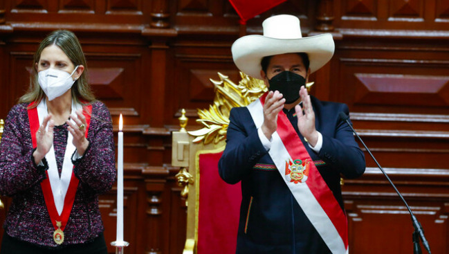 «Yo, José Pedro Castillo Terrones, juro por Dios, por mi familia, por mis hermanas y hermanos peruanos, campesinos, pueblos originarios, ronderos, pescadores, docentes, profesionales, niños, jóvenes y mujeres, que ejerceré el cargo de presidente de la República en el período constitucional 2021-2026. Juro por los pueblos del Perú, por un país sin corrupción y por una nueva Constitución”, pronunció al asumir el cargo.