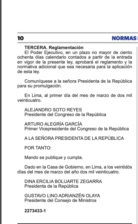 La norma está suscrita por el presidente del Congreso de la República, Alejandro Soto Reyes y el primer vicepresidente, Arturo Alegría García.