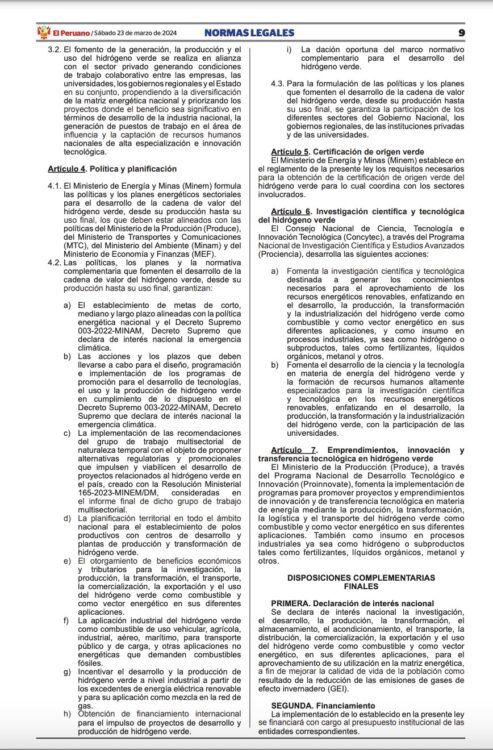 En sus Disposiciones Complementarias Finales, la norma declara de interés nacional la investigación, el desarrollo, la producción, la transformación, el almacenamiento, el acondicionamiento, el transporte, la distribución, la comercialización, la exportación y el uso del hidrógeno verde como combustible y como vector energético, en sus diferentes aplicaciones.