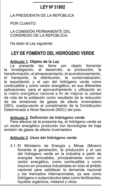El Congreso de la República publicó la Ley 31992, Ley de fomento del hidrógeno verde, que tiene por objeto fomentar la investigación, el desarrollo, la producción, la transformación, el almacenamiento, el acondicionamiento, el transporte, la distribución, la comercialización, la exportación y el uso del hidrógeno verde como combustible y como vector energético, en sus diferentes aplicaciones.