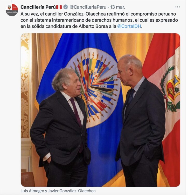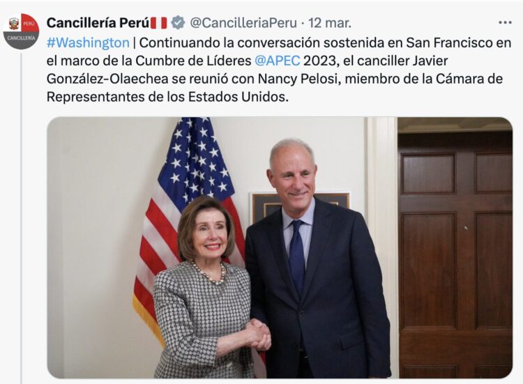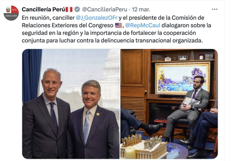 En el marco de su visita a Washington D.C., la agenda del Canciller peruano incluyó reuniones con el Secretario General de la OEA Luis Almagro; con la Expresidenta de la Cámara de Representantes, la Congresista Nancy Pelosi; el Presidente de la Comisión de Relaciones Exteriores de la Cámara de Representantes; el Congresista Michael McCaul; y los co-presidentes del Caucus Perú en el Congreso estadounidense, Congresistas Carlos Giménez y Robert García.