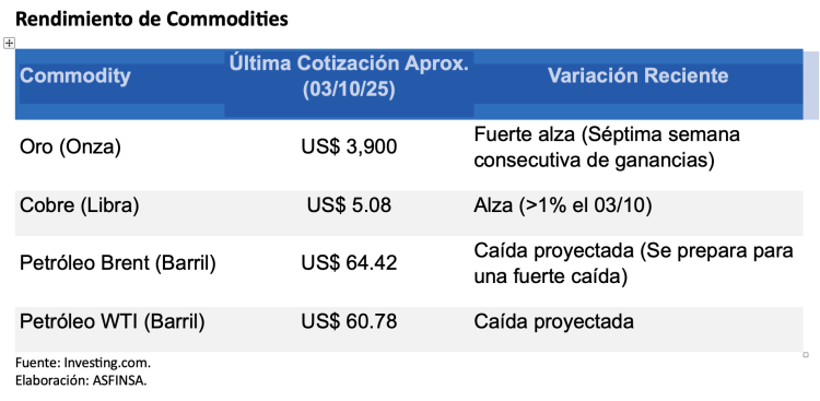 El mercado global de commodities en el periodo de setiembre a octubre del 2025 ha mostrado una marcada diferencia, entre el nerviosismo geopolítico y la desaceleración industrial. El Oro se convirtió en el único activo estrella, mientras que el Petróleo mostró debilidad, y los metales básicos como el Cobre se mantuvieron en situaciones de adaptación generados por problemas de suministro. Esta diferencia lleva a una dualidad de los mercados: por un lado, la búsqueda de refugio ante el riesgo y por otro la preocupación por la demanda industrial futura.