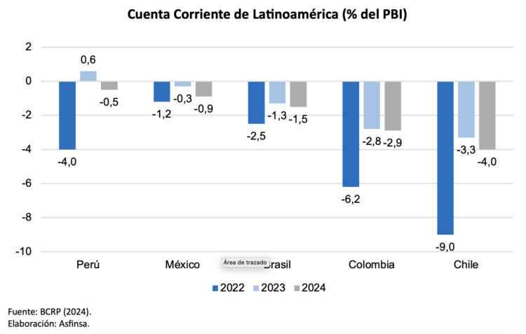 Para el 2024, se proyecta una ligera ampliación del déficit en cuenta corriente en la mayoría de los países analizados. Perú, que logró un superávit en el 2023, podría enfrentar un déficit pequeño de -0.5%. México, Brasil y Colombia podrían experimentar leves aumentos en sus déficits.